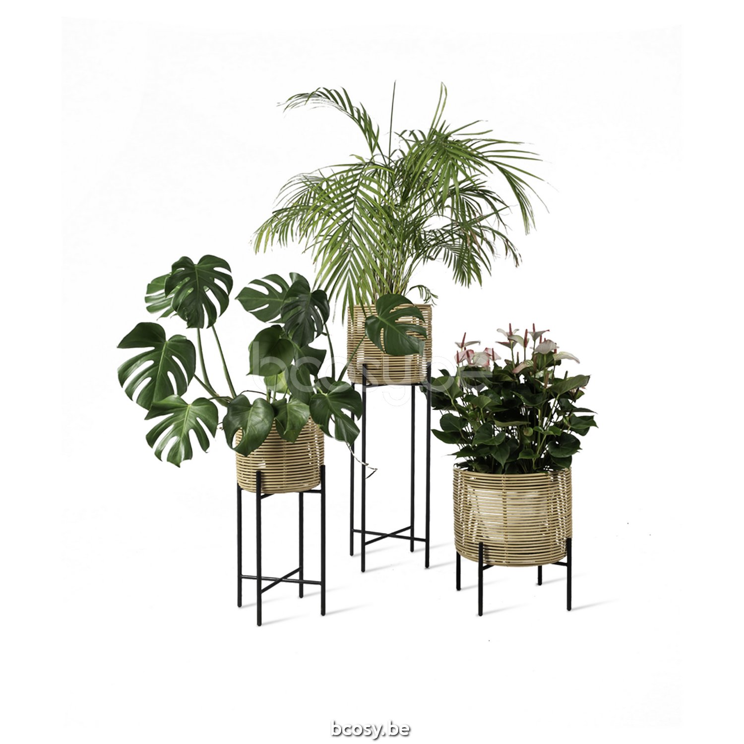 Material: Schwarz pulverbeschichtetes Stahlgestell mit Pflanzenkorb aus Natur-Rattan. Inklusive Kunststoffschale.
