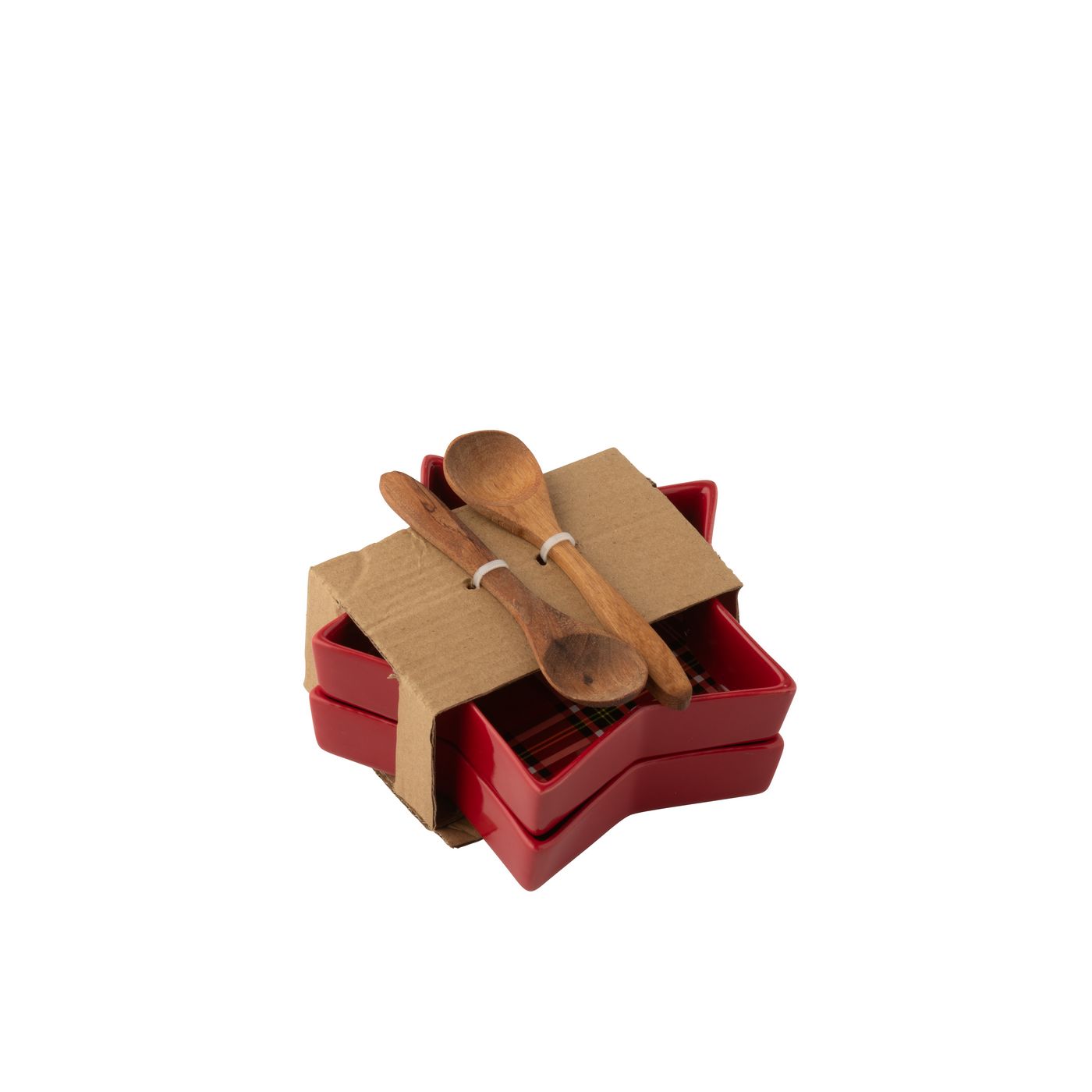 J-Line Doos Van 2 Schaal Plaid Ster Keramiek Rood L14xB14xH7 cm