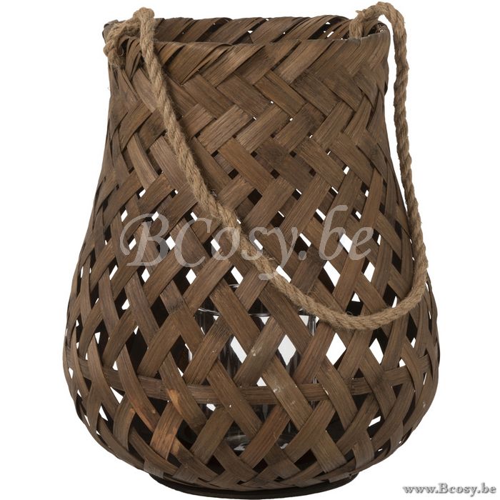 Jline Lantaarn Gevlochten Rond Bamboe Glas Donkerbruin Large