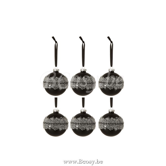 J-Line Doos Van 6 Kerstballen Suiker Midden Diamanten Lijn Glas Mat Zwart Small Ø8