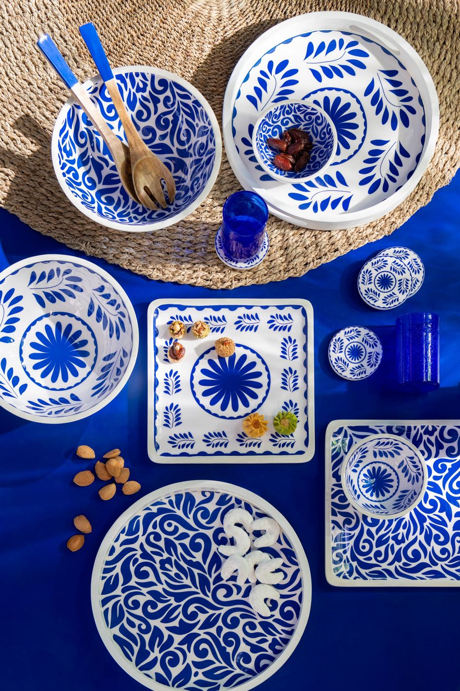 J-Line by Jolipa Bol Motif Floral Bois De Manguier Bleu/Blanc Medium Assortiment De 2