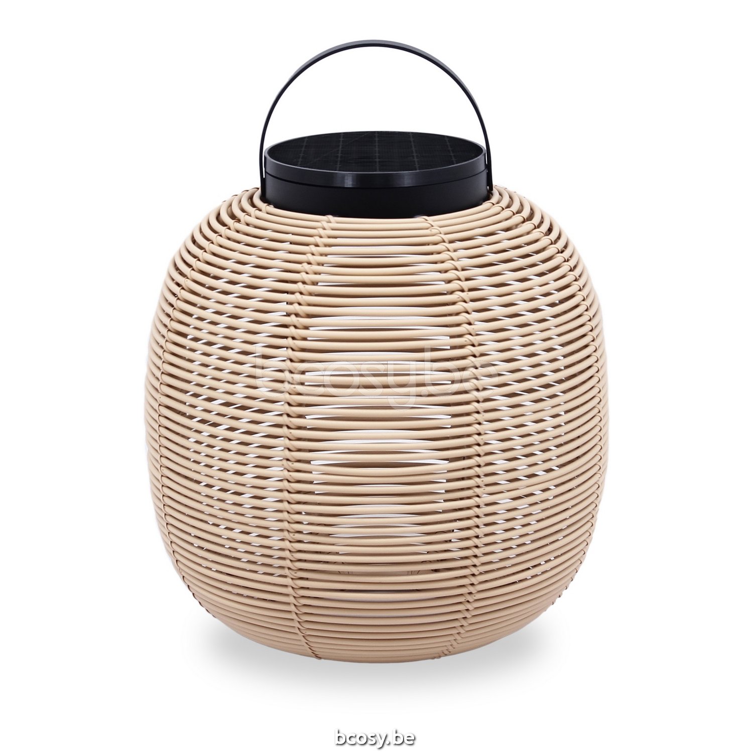 Matériel: Lampe d'extérieur en osier HDPE sur un cadre en aluminium peint par poudrage. Avec module LED solaire. Module LED solaire de 3W avec capteur de lumière inclus. Lumière blanc chaud (2700K). Adaptateur EU/UK/US/AU inclus. 6 à 8 heures d'éclairage par charge complète