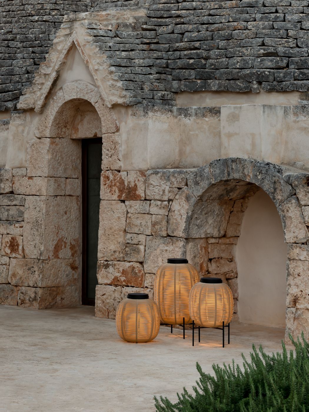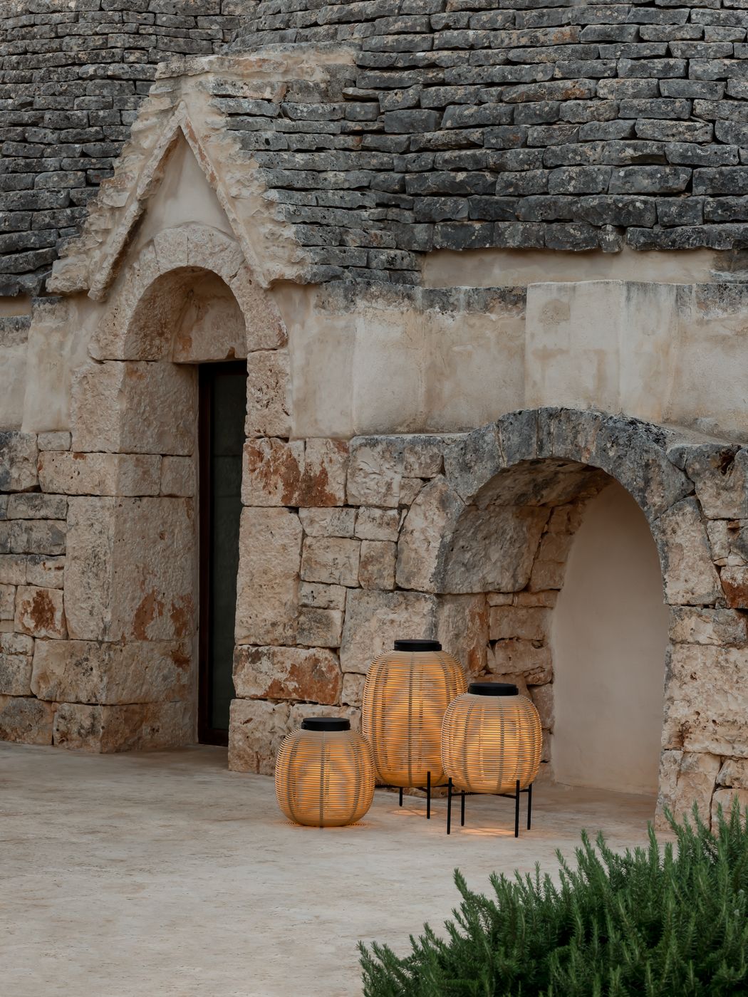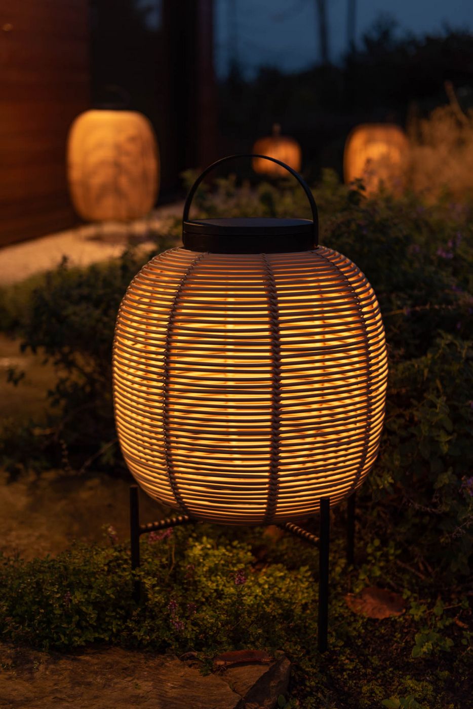 Material: Outdoor lamp in HDPE wicker on a powder coated aluminium frame. With solar led module. 3W solar LED module with light sensor included. Warm white light (2700K). EU/UK/US/AU adapter included. 6 - 8 hours light per full charge