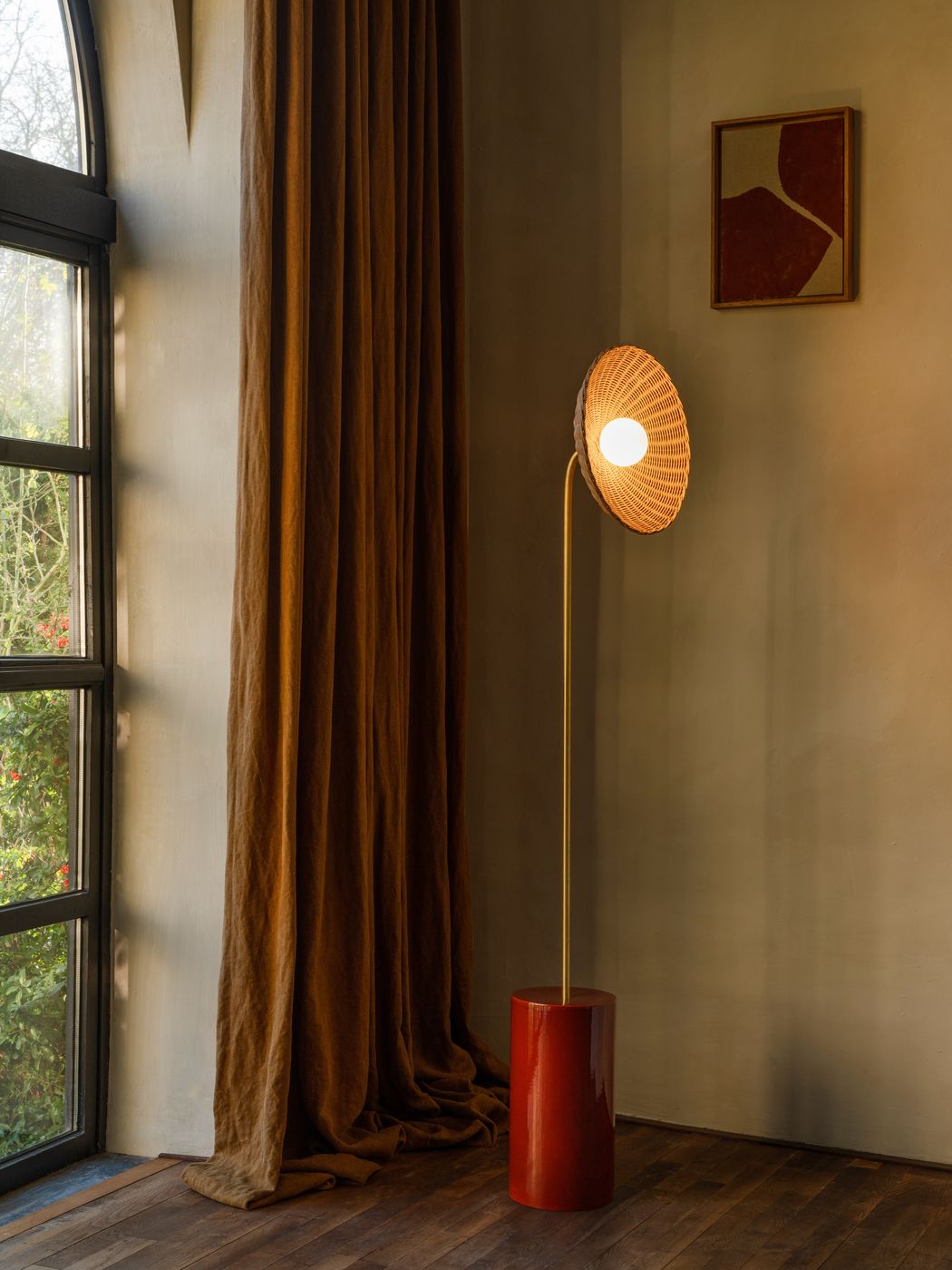 English: Vincent Sheppard Arvin Floor lamp Base curved Maroon Ceramic frame Natural Rattan