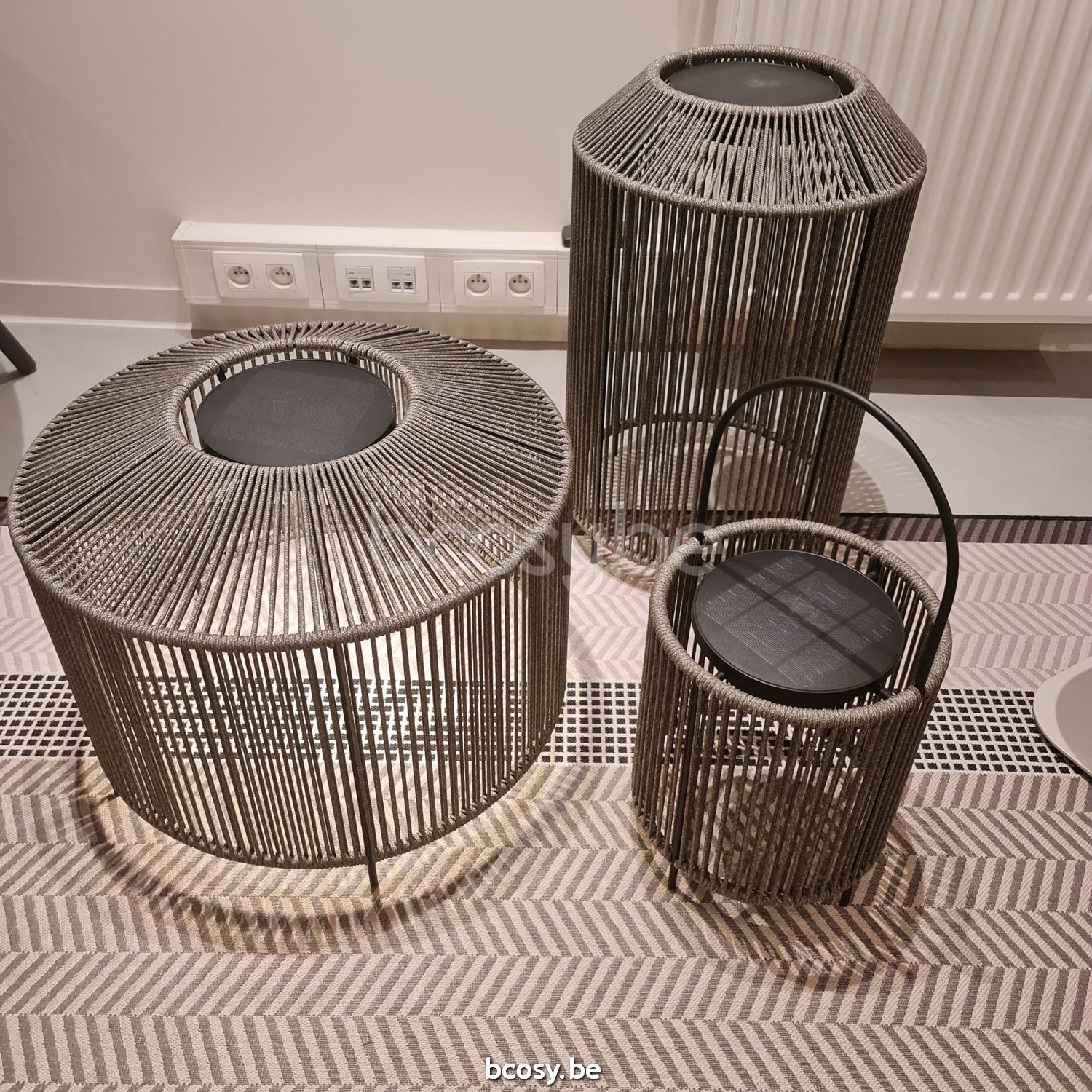 Material: Outdoor lamp with solar led module. Polypropylene rope on a powder coated steel frame. 3W solar LED module with light sensor included. Warm white light (2700K). EU/UK/US/AU adapter included. 6 - 8 hours light per full charge