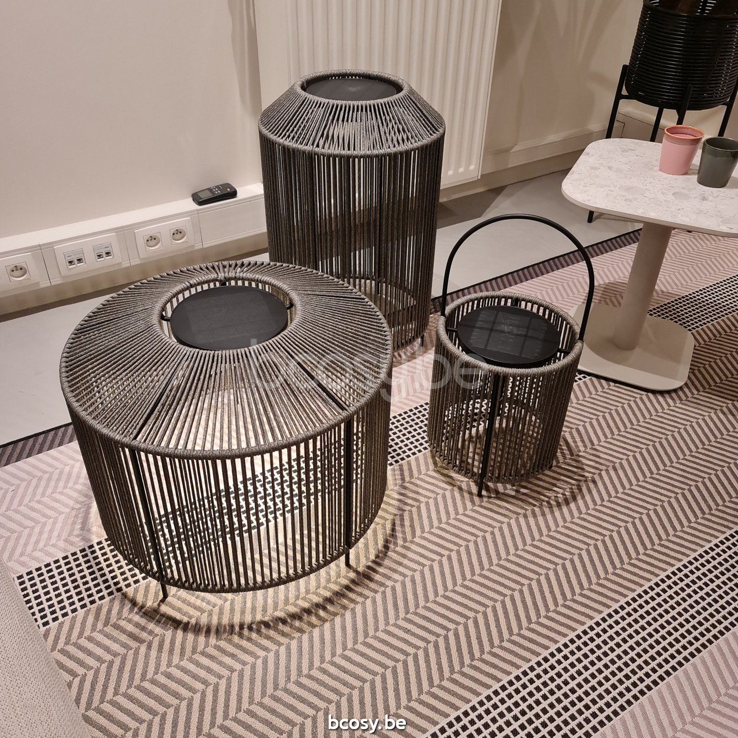 Material: Outdoor lamp with solar led module. Polypropylene rope on a powder coated steel frame. 3W solar LED module with light sensor included. Warm white light (2700K). EU/UK/US/AU adapter included. 6 - 8 hours light per full charge