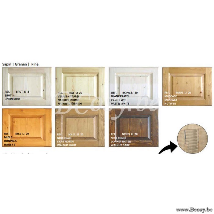 Kleuren: Verkrijgbaar in bruut hout zonder afwerking ofwel 6 transparante lazuurkleuren ofwel 27 kleurlakken