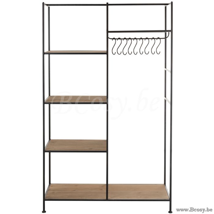 J-Line halkapstok kledingrek met schappen j line Industrieel zwartstalen tekstiel hangrek met hout Textiel Rek Metaal Zwart 115 L111xB52xH181 cm