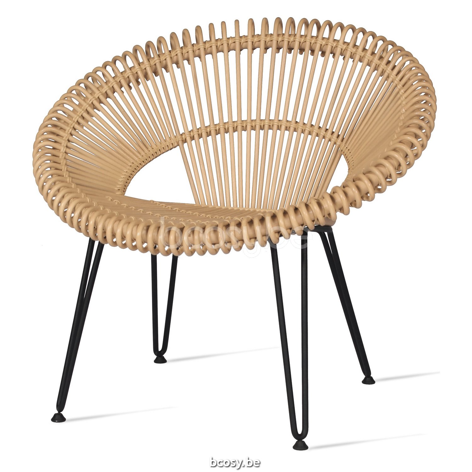 Materiaal: Stoel met rotan zitting in natuurlijk rotan op zwart gepoedercoat stalen frame. Zwarte kantelbare nylon glijders.