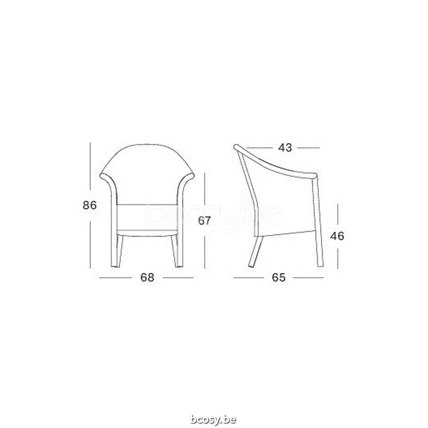Afmetingen/Dimensions/Dimensionen: L=68 cm B=65 cm H=86 cm SH=46 cm AH=67 cm SD=43 cm
