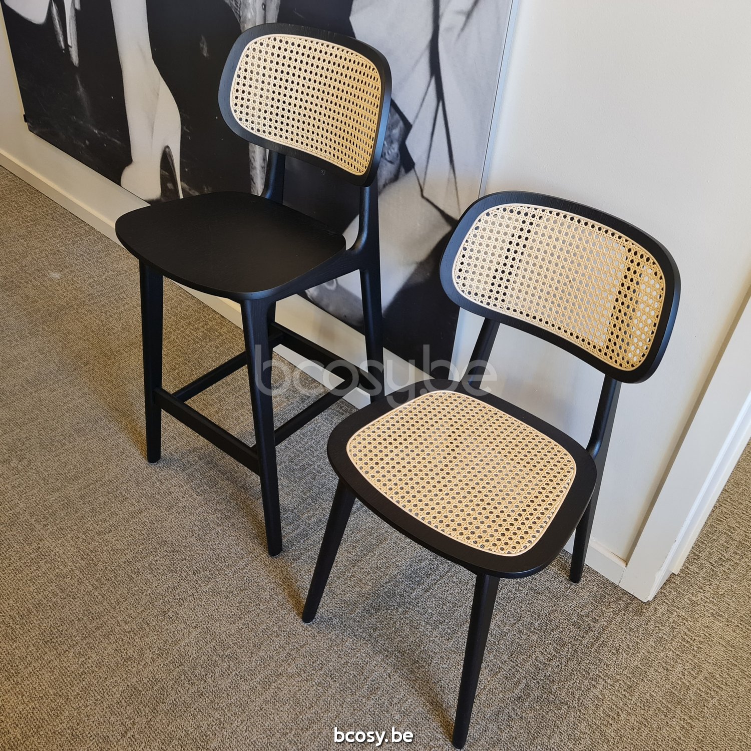 Material: Black stained oak chair with a cane backrest and a cane seat, plywood seat or an upholstered seat. Felt glides.