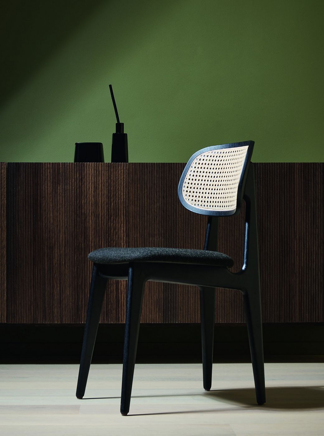 English: Vincent Sheppard Titus Dining Chair Black Stained Oak frame Black Bouclé Cane Backrest