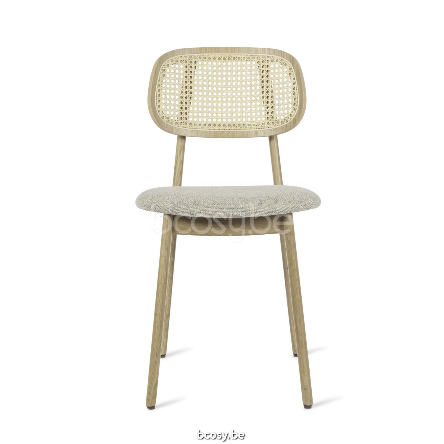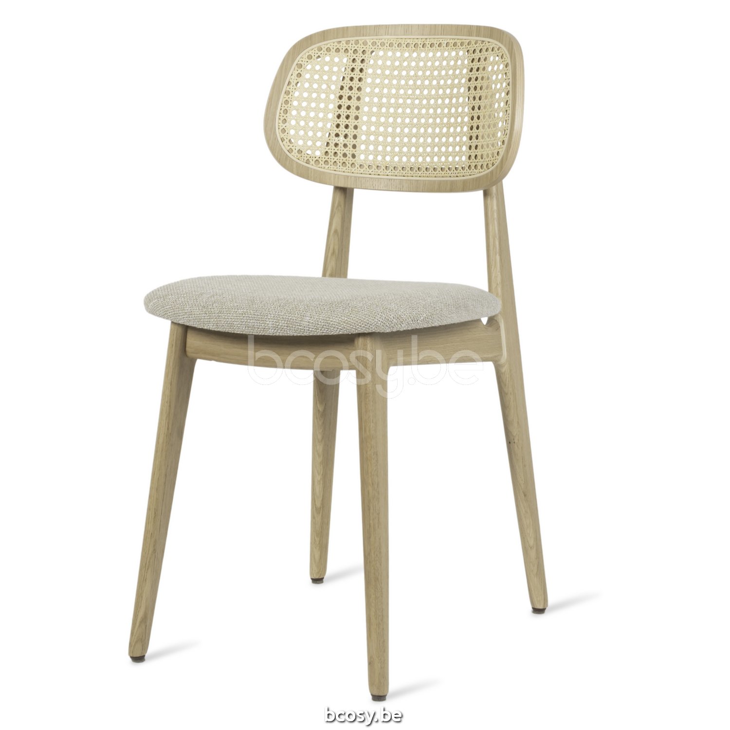 Matériel: Chaise en chêne verni naturel avec dossier cannage et assise tapissée. Patins en feutre.