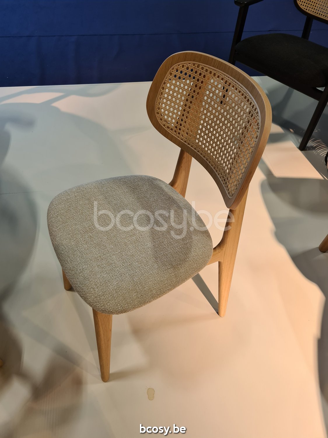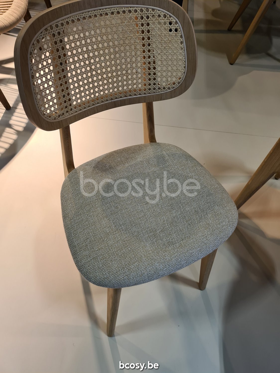 Material: Natural varnished oak chair with a cane backrest and an upholstered seat. Felt glides.