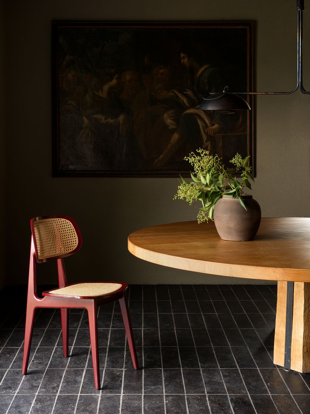 English: Vincent Sheppard Titus Dining Chair Burgundy Beech frame Cane Seat Cane Seat and Backrest
