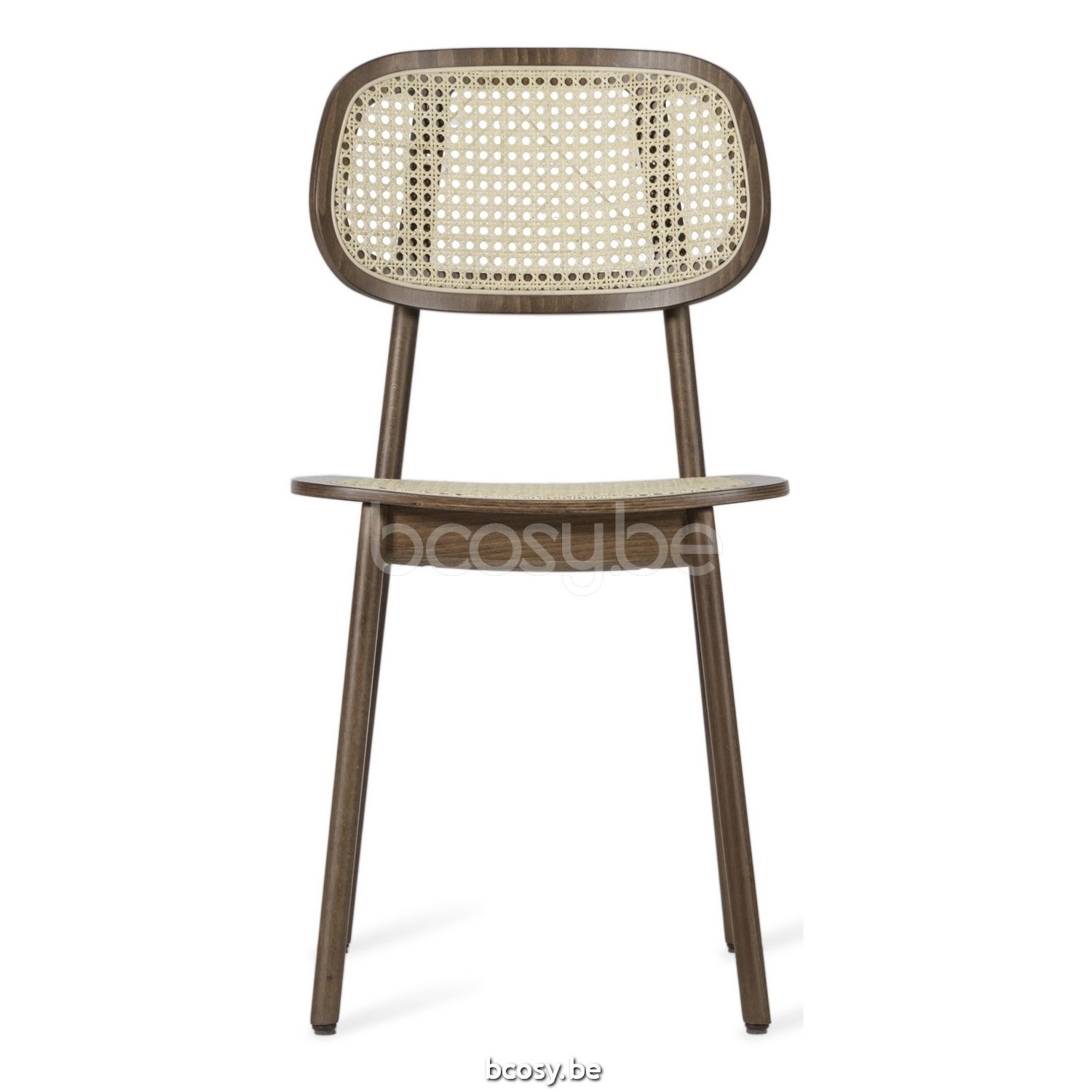 Matériel: Chaise en hêtre teinté tabac avec dossier cannage et assise cannage, assise en contreplaqué ou assise tapissée. Patins en feutre.