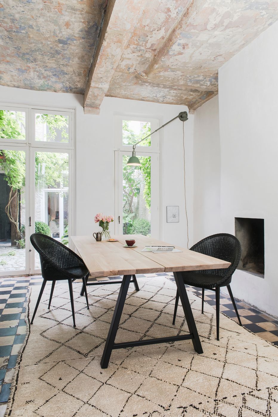 English: Vincent Sheppard Albert Dining Table Two-piece Top 260x100 Black Powder Coated Steel A frame Natural Oak top 4cm beveled edge