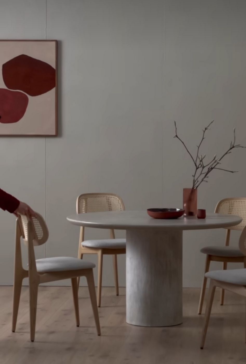 Material: Round or oval dining table in volcanic mineral plaster. Felt glides.