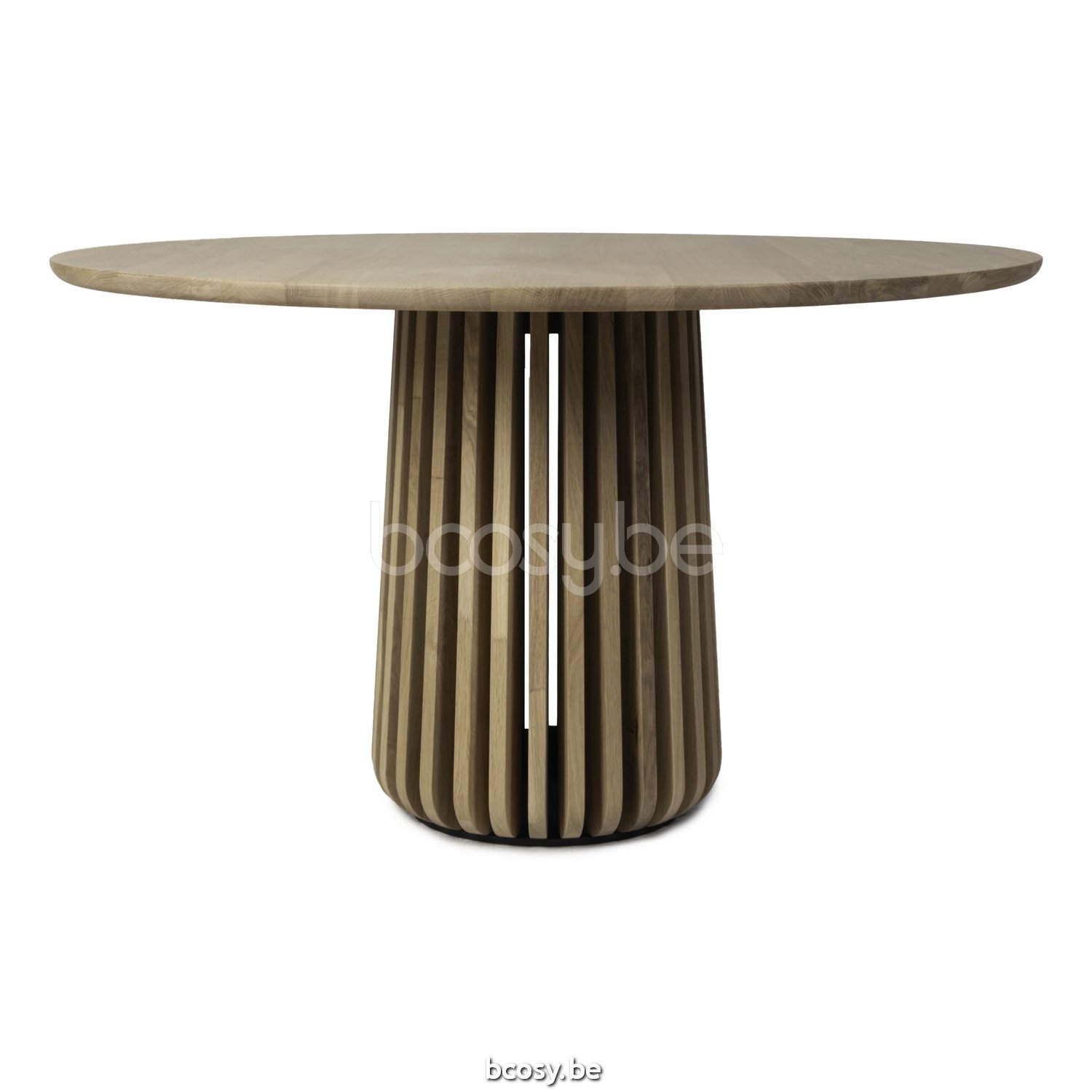 Matériel: Plateau de table rond en chêne massif verni naturel avec une base conique en chêne à lattes. Dia 130 cm plateau / dia 50 cm base. Dia 150 cm plateau / dia 60 cm base. Patins en feutre.