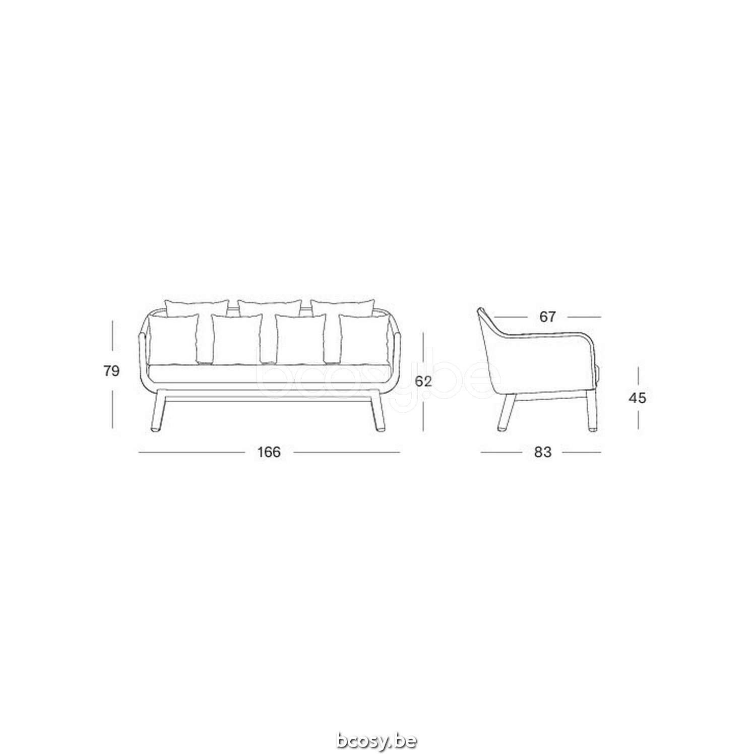 Afmetingen/Dimensions/Dimensionen: L=166 cm B=84 cm H=79 cm SH=46 cm AH=62 cm SD=67 cm