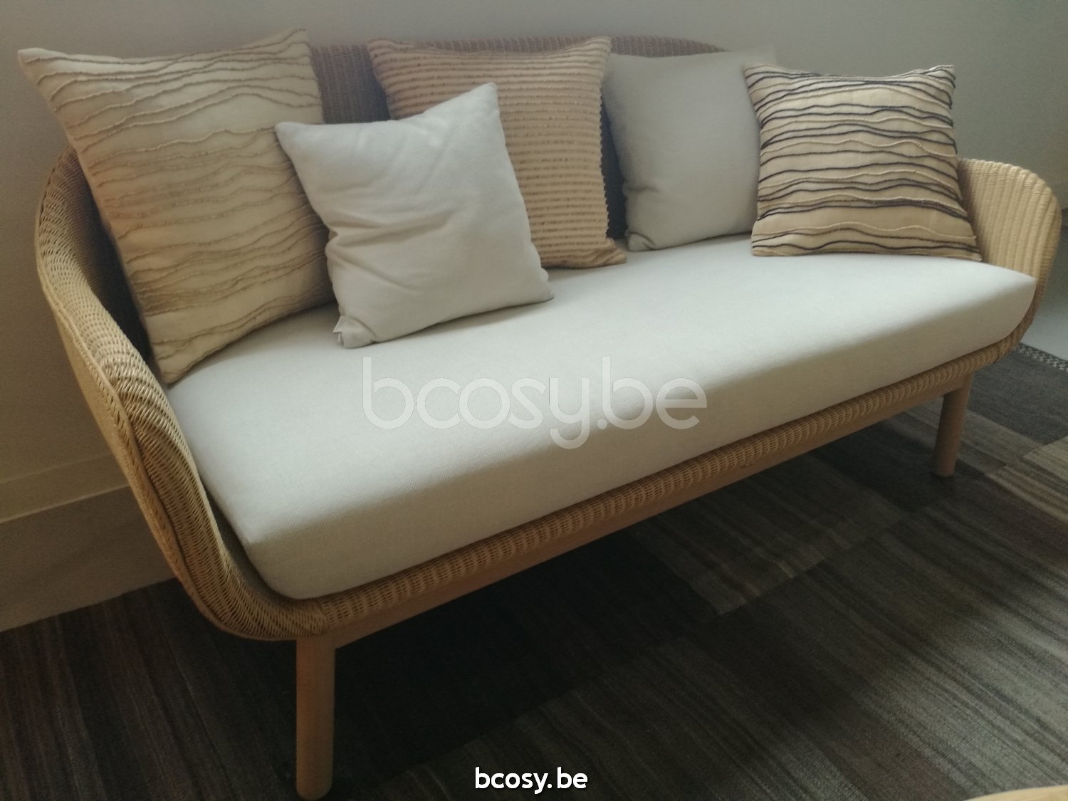 Matériel: Canapé avec assise Lloyd Loom sur une base en chêne massif verni. Patins en nylon blanc. Patins en feutre disponibles sur demande. Combinaison recommandée de coussins déco : 1x deco 50x50, 1x deco 40x40.