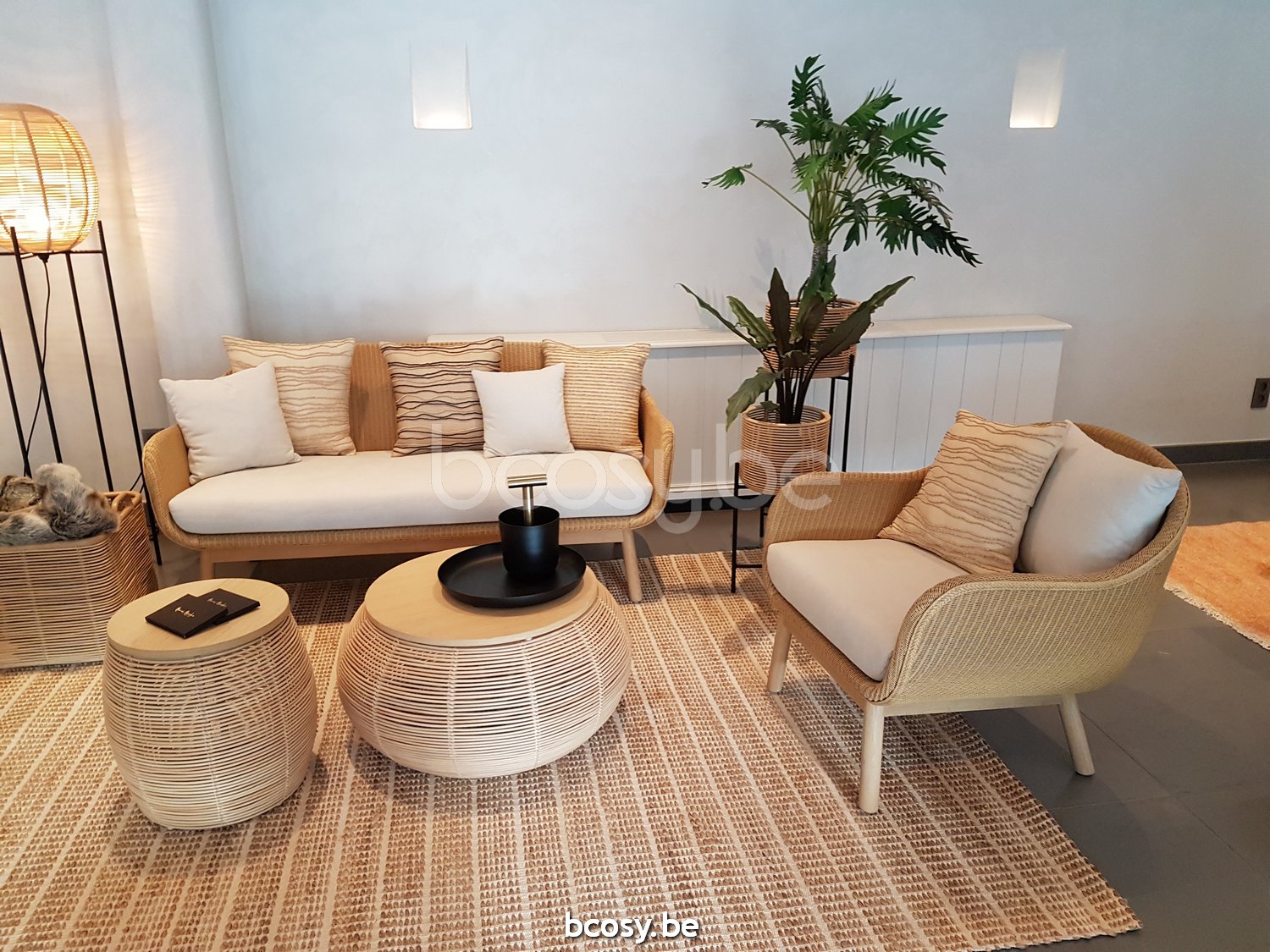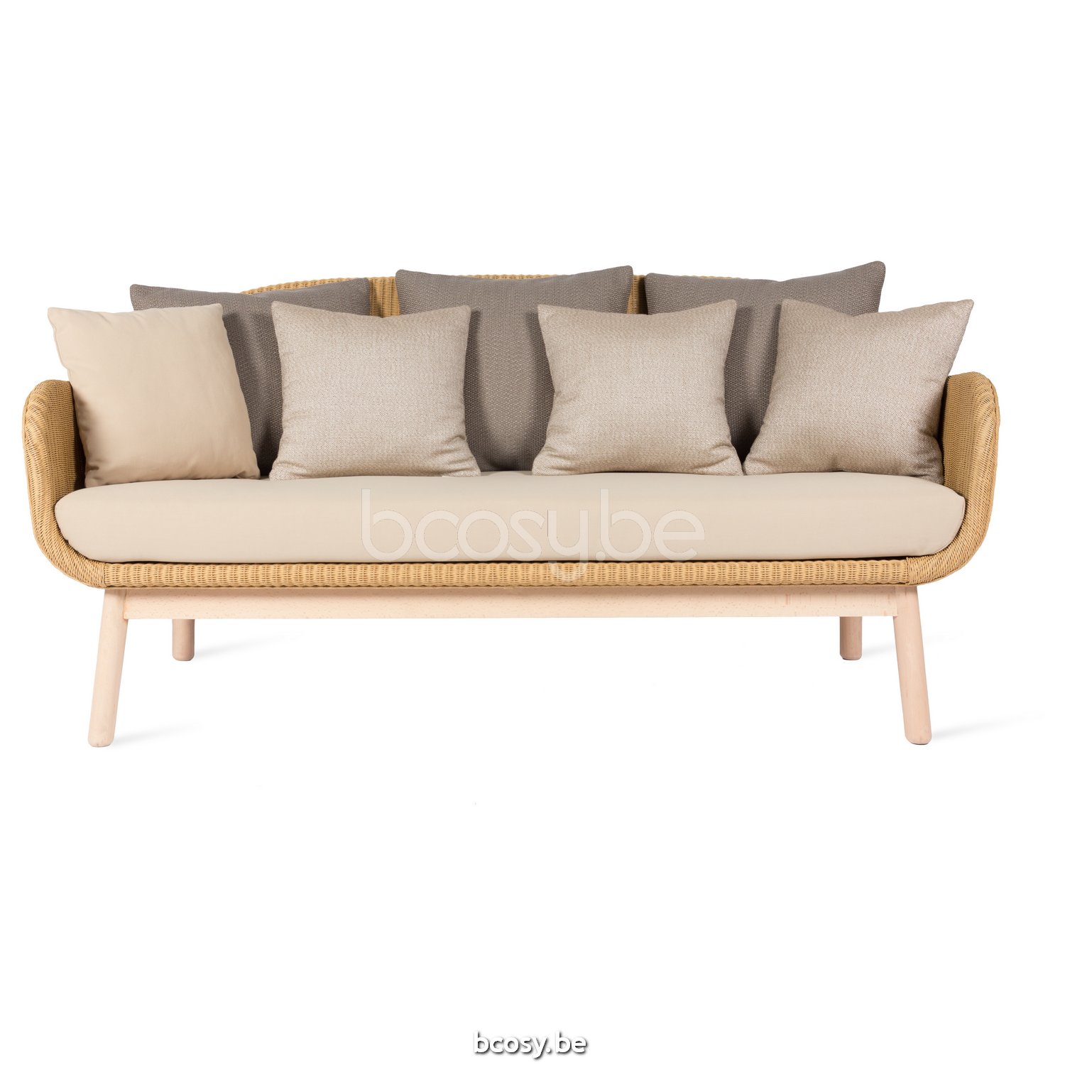 Materiaal: Sofa met Lloyd Loom zitting op een gelakt massief eiken onderstel. Witte nylon glijders. Viltglijders verkrijgbaar op aanvraag. Aanbevolen deco kussencombinatie: 1x deco 50x50, 1x deco 40x40.