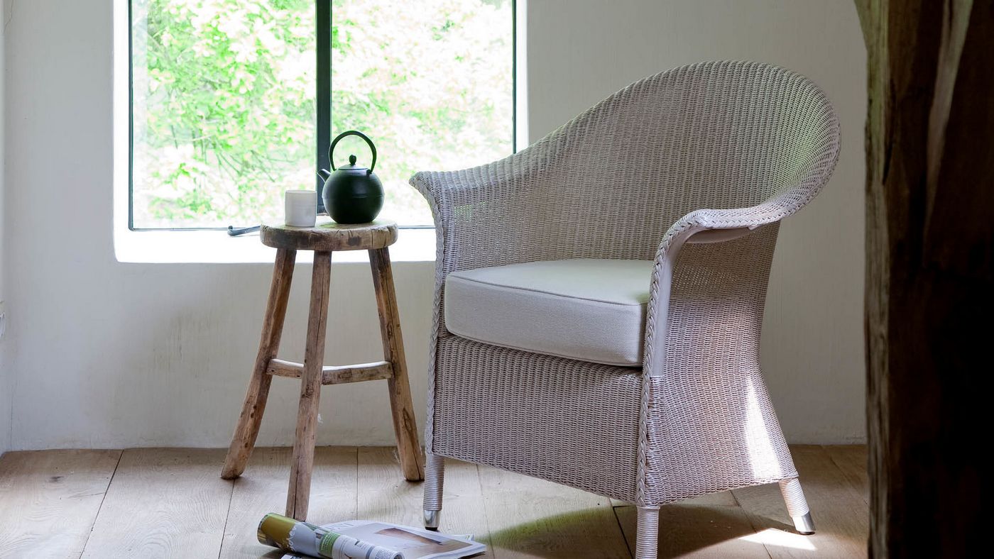 Material: Lloyd Loom seat on a rattan frame. Black nylon glides. Felt glides available on request. Standard ferrules: chrome.