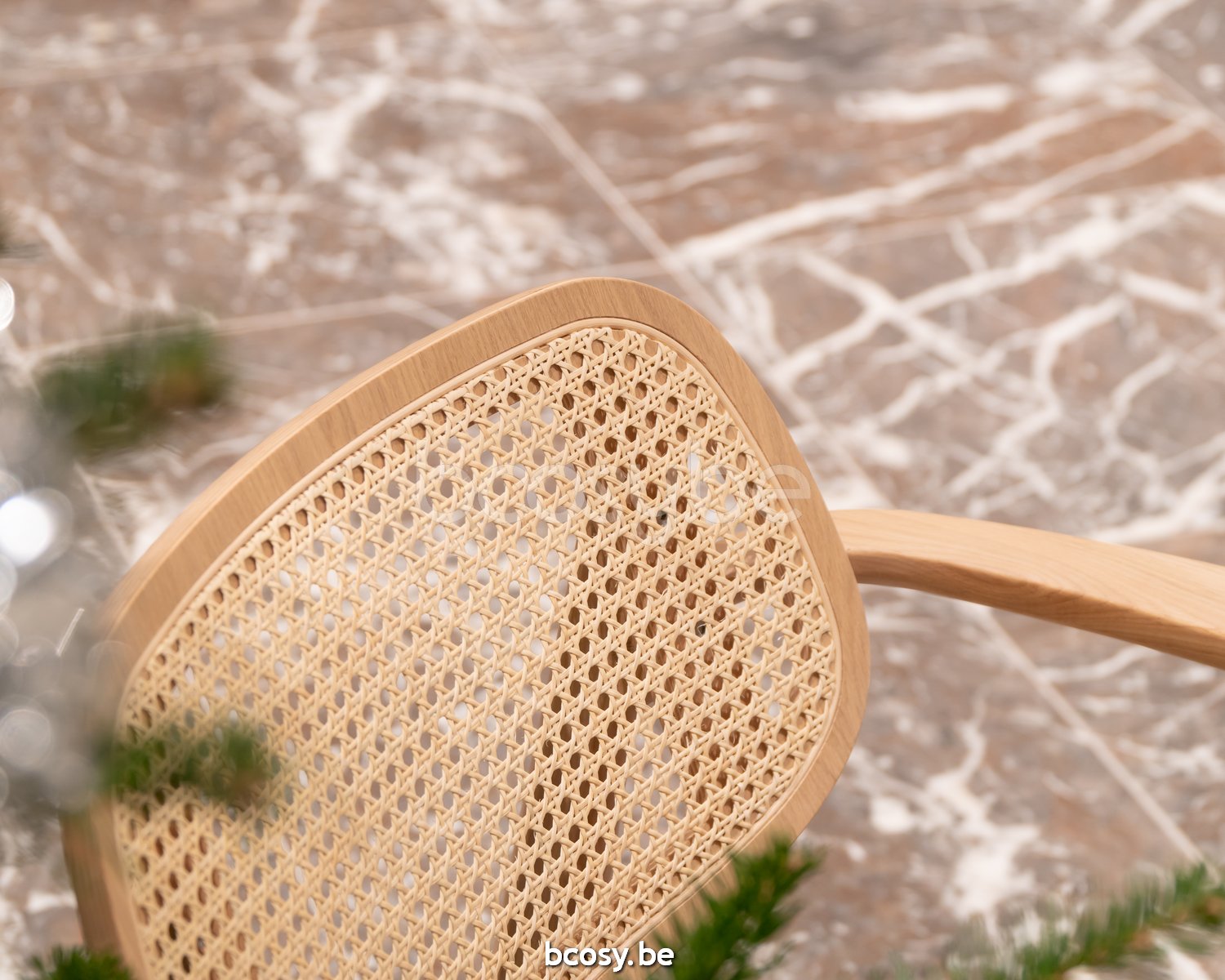Matériel: Chaise de salon en chêne verni naturel avec assise rembourrée. Patins en nylon blanc.