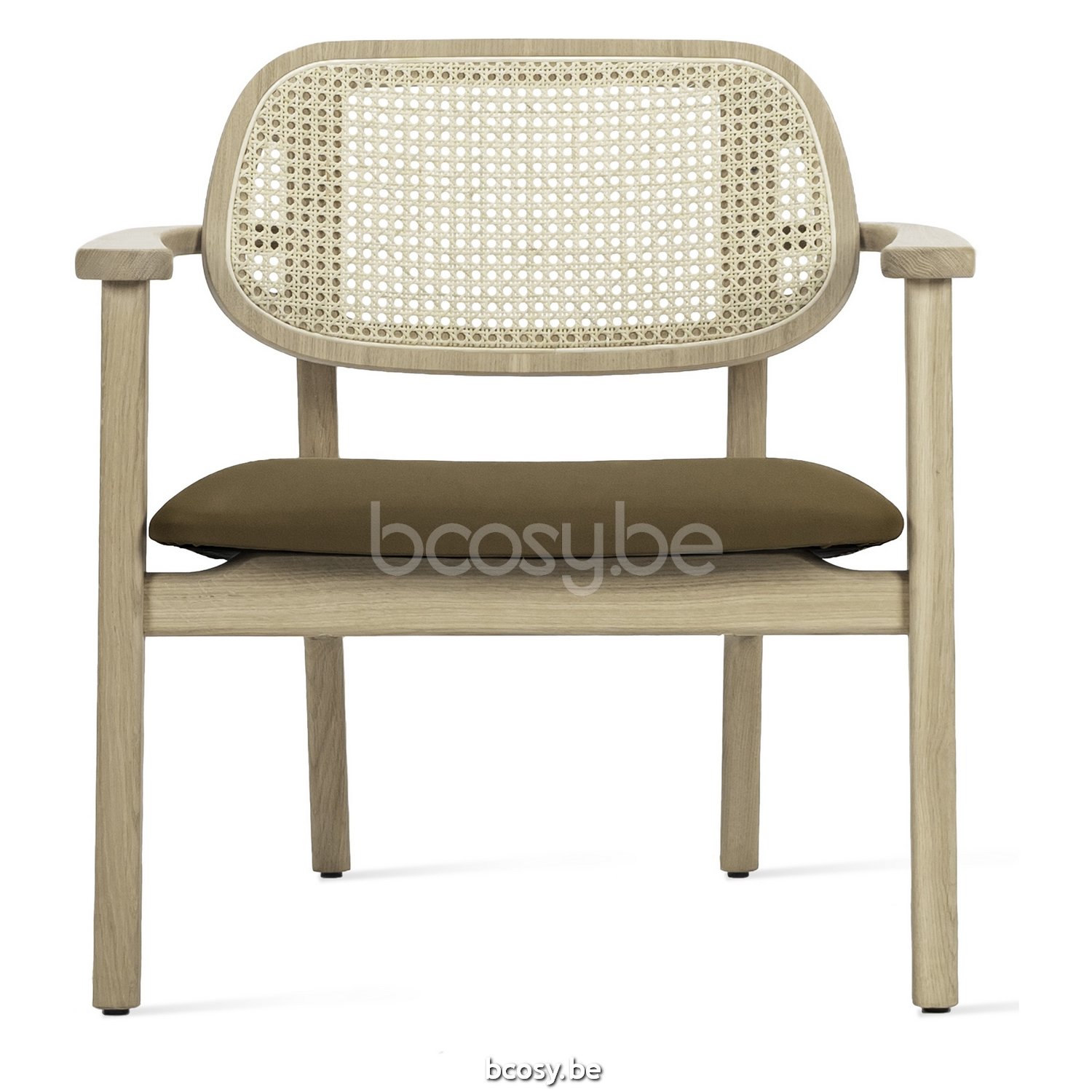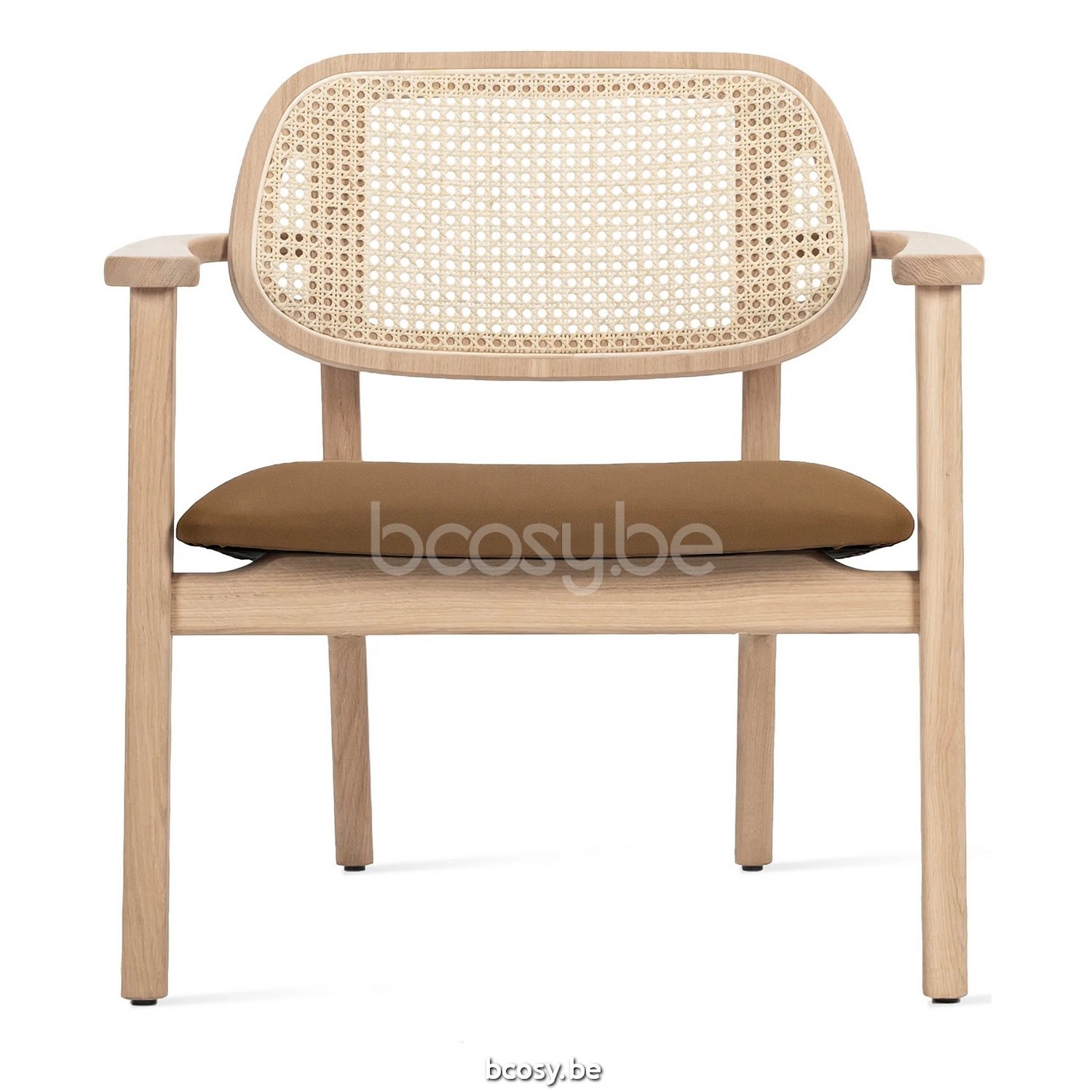 Materiaal: Eikenhouten loungestoel naturel gelakt met een gestoffeerde zitting. Witte nylon glijders.