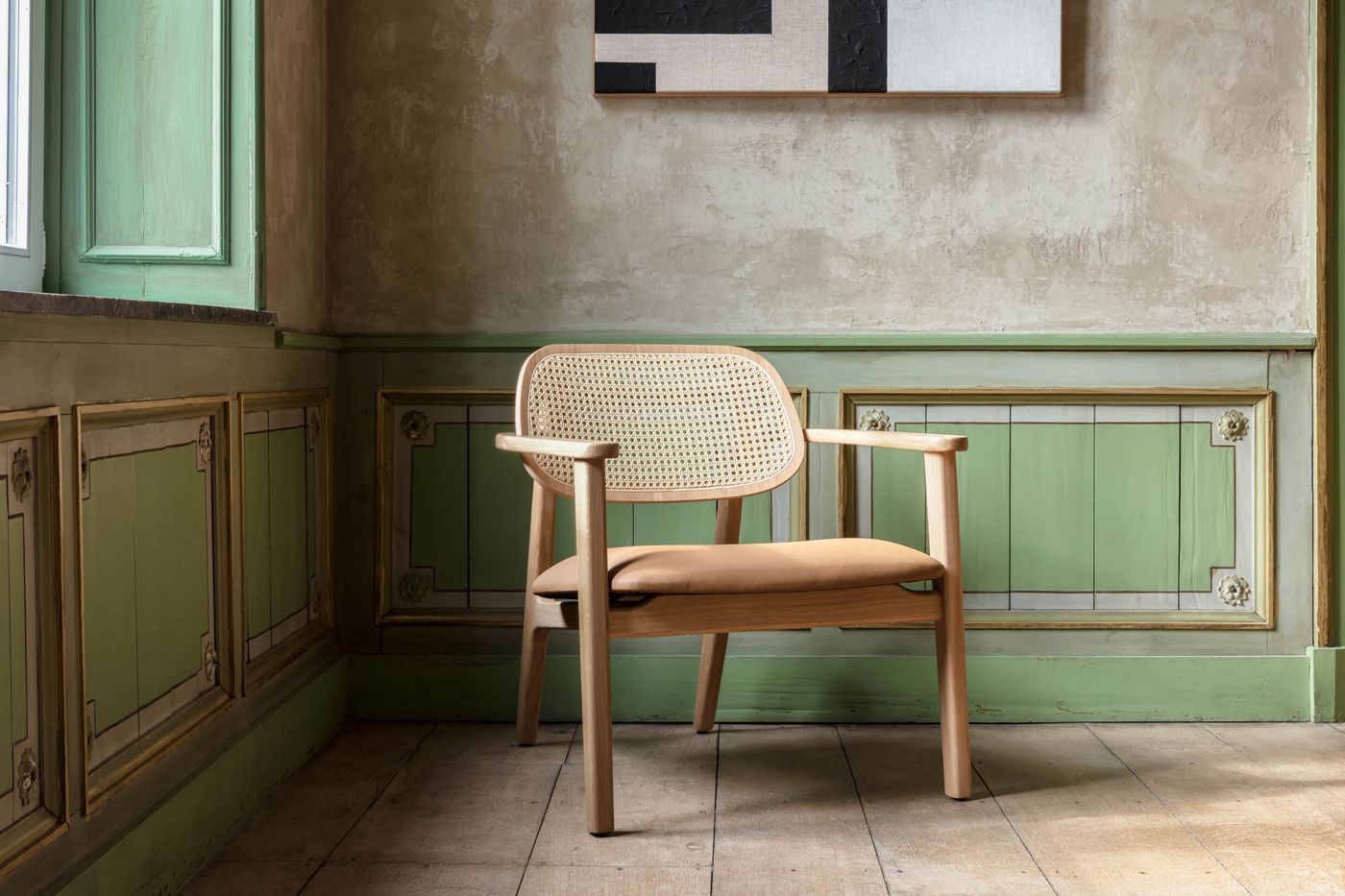 English: Vincent Sheppard Titus Lounge Chair Natural Varnish Oak frame Chestnut Vegan Leather