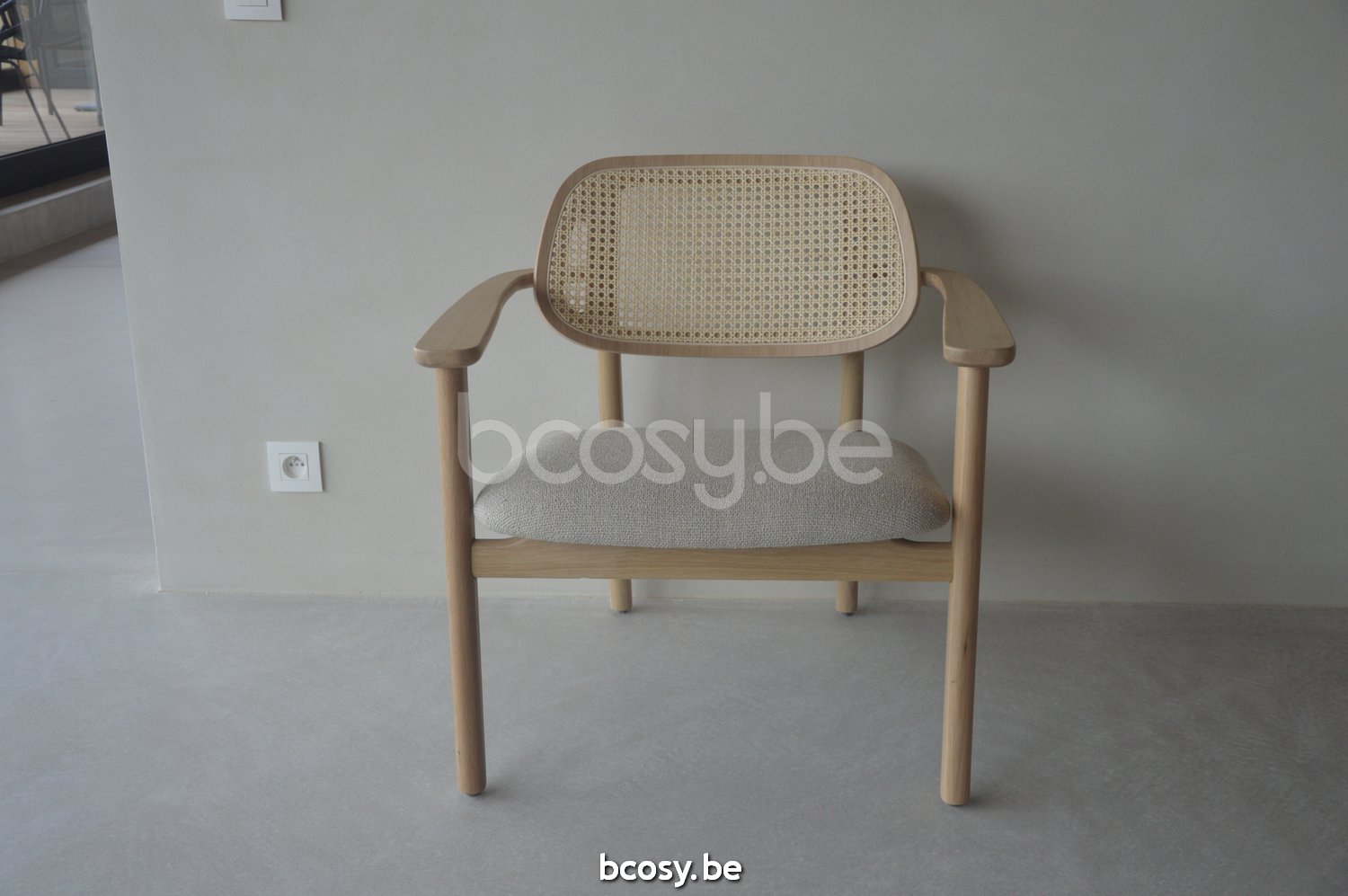 Materiaal: Eikenhouten loungestoel naturel gelakt met een gestoffeerde zitting. Witte nylon glijders.