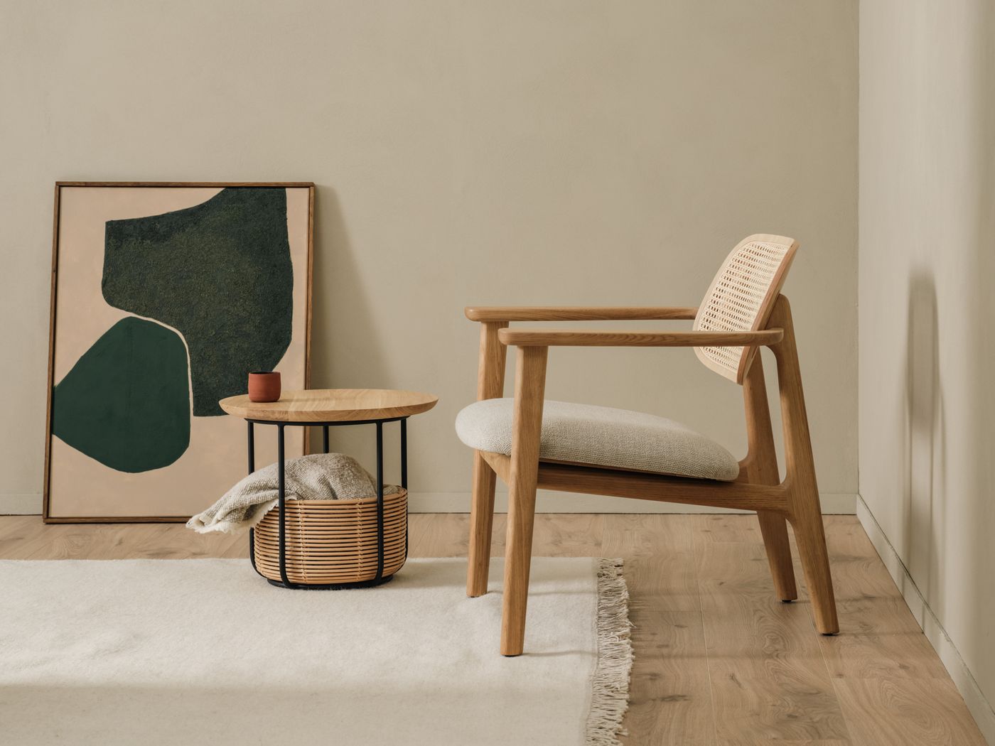 Vincent Sheppard Titus Loungesessel natur Titus Lounge Stuhl Rahmen aus Naturfarbener Lack Eiche Lime Weiß Bouclé