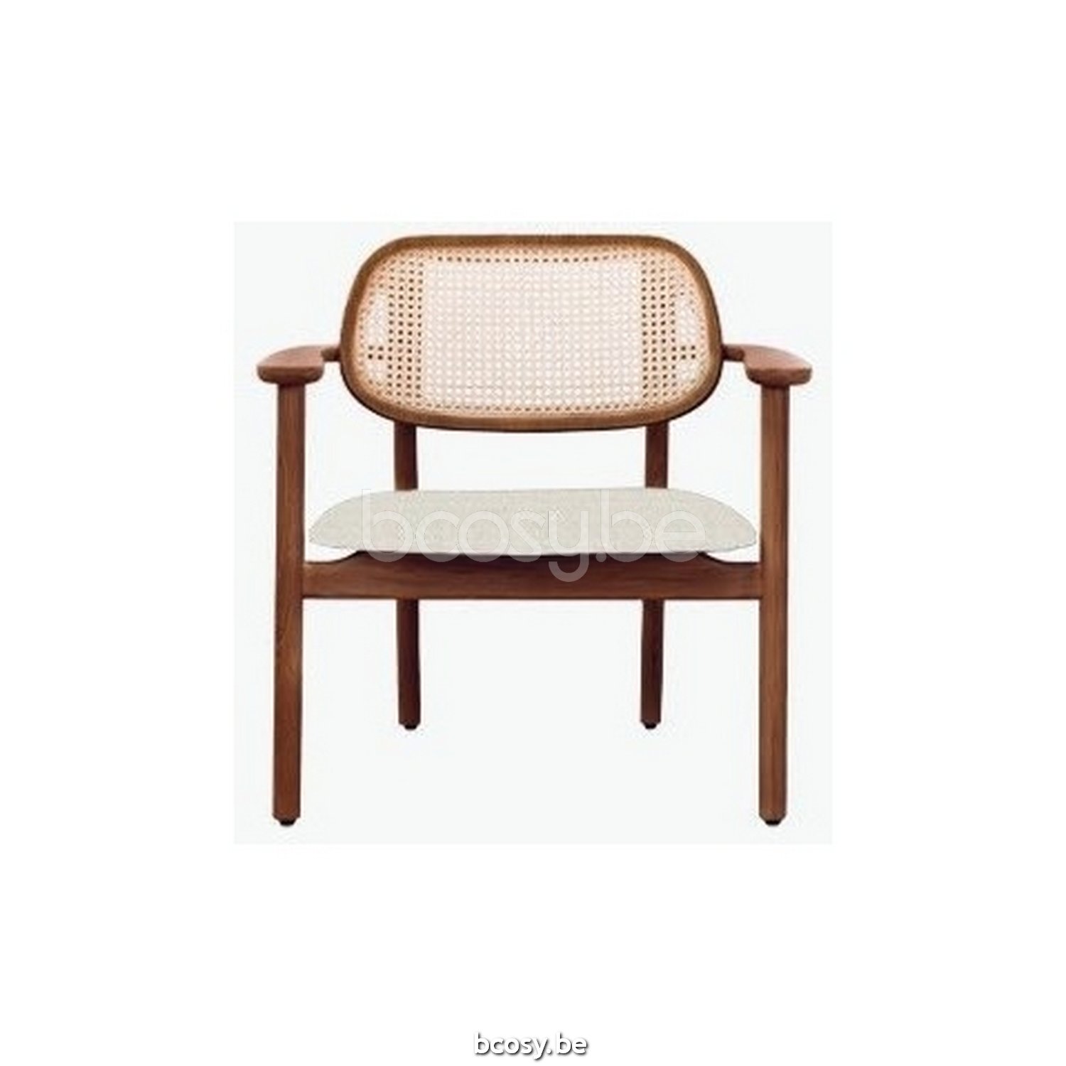 Materiaal: Tabakkleurige beuken loungestoel met een gestoffeerde zitting. Zwarte nylon glijders