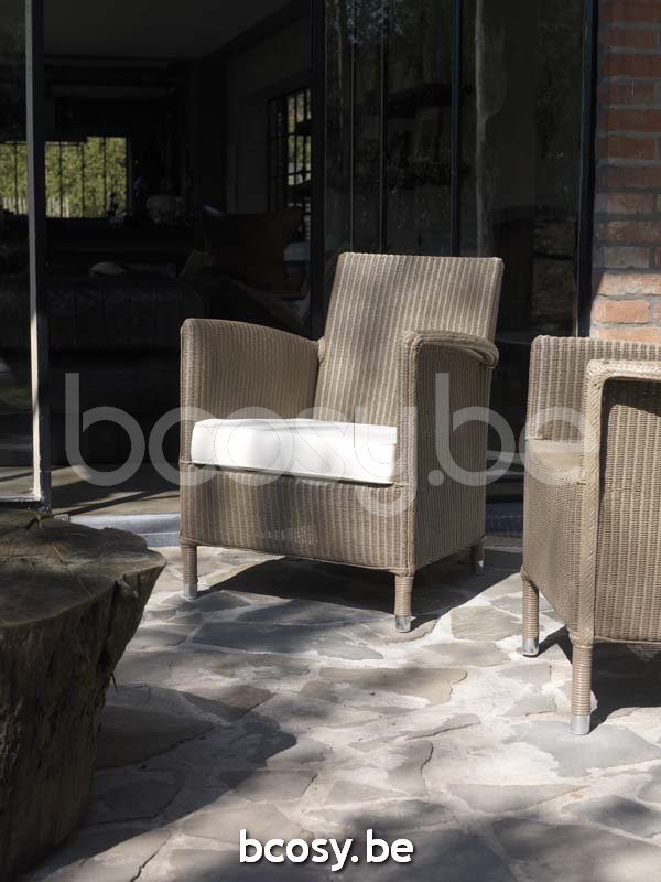 Materiaal: Lloyd Loom behandeld voor buitengebruik op een aluminium frame. Moet binnen opgeslagen worden bij vochtig en koud weer. Maar alleen geschikt voor droge klimaten.