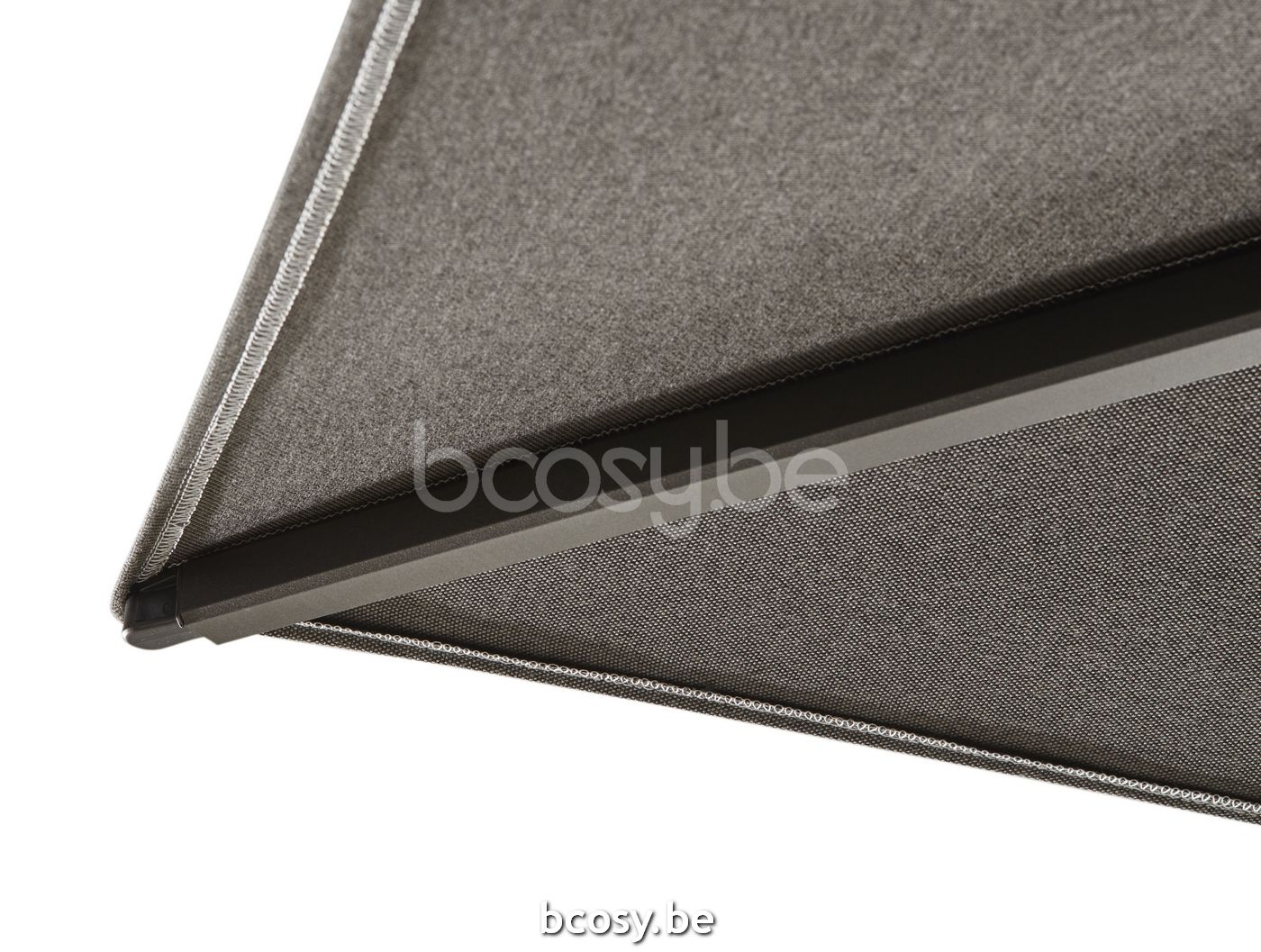 Model: Middenstam parasol met push-up systeem. Mast en baleinen zijn aluminium gepoederlakt. Profiel mast: 40 x 40 x 1,5 mm, 1,6 x 1,6 x 0,06". Profiel baleinen: 22 x 22 x 1,6 mm, 0,9 x 0,9 x 0,06. RVS LOXX® om het doek eenvoudig aan het frame te bevestigen en af te nemen. Ook verkrijgbaar met een grondanker aan een lagere prijs.