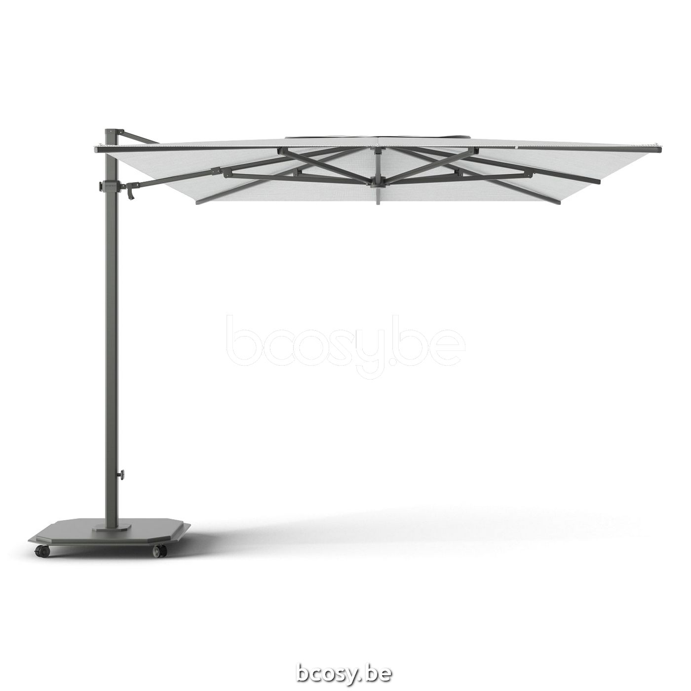 Model: Vrijhangende parasol met opendraaier. Mast en baleinen zijn aluminium gepoederlakt. Profiel mast: 100 x 100 x 3,5 mm, 3,9 x 3,9 x 0,2". Profiel baleinen: 32 x 32 x 1,6 mm, 1,2 x 1,2 x 0,06". RVS LOXX® om het doek eenvoudig aan het frame te bevestigen en af te nemen. Ook verkrijgbaar met een grondanker aan een lagere prijs.