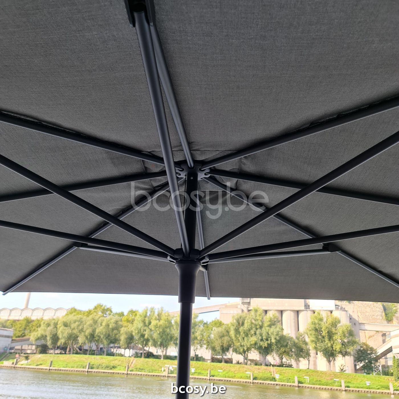Modèle: Parasol à mât central. ø 40 mm, 1.6". Le mât et les baleines sont aluminium thermolaqués.