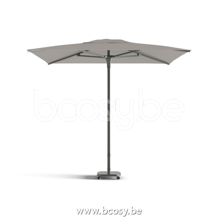 Model: Middenstam parasol met push-up systeem. Mast en baleinen zijn aluminium gepoederlakt. Profiel mast: 40 x 40 x 1,5 mm, 1,6 x 1,6 x 0,06". Profiel baleinen: 22 x 22 x 1,6 mm, 0,9 x 0,9 x 0,06. RVS LOXX® om het doek eenvoudig aan het frame te bevestigen en af te nemen. Ook verkrijgbaar met een grondanker aan een lagere prijs.