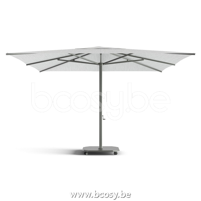 Parasolvoet: Warm verzinkte staalplaat, gepoederlakt. Inclusief bij aankoop van een parasol. Voet met vier wielen die 360° draaien, elk met een rem om de parasol vast te zetten. Heeft dezelfde kleur als de mast.