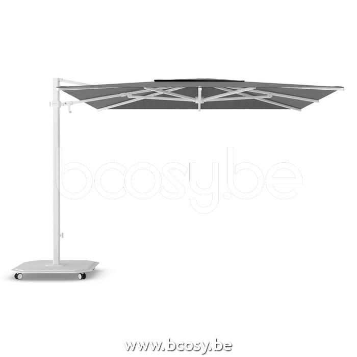 Parasolvoet: Warm verzinkte staalplaat, gepoederlakt. Inclusief bij aankoop van een parasol. Voet met vier wielen die 360° draaien, elk met een rem om de parasol vast te zetten. Heeft dezelfde kleur als de mast. Voor een mast in cappuccino of alu teak voorzien we een charcoal voet.