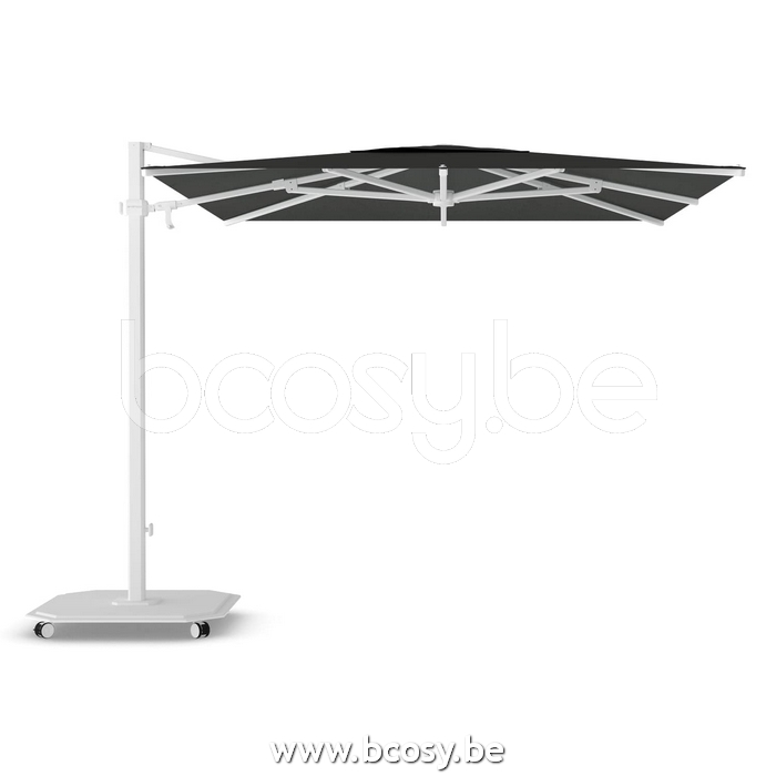 Pied de parasol: Tôle d'acier galvanisé à chaud, thermolaqué. Inclus à l'achat du parasol. Socle avec 4 roues qui tournent à 360°, chacune avec des freins pour fixer le parasol. Le socle a la même couleur que le mât. Un socle en charcoal est fournie pour un mât en alu teck.