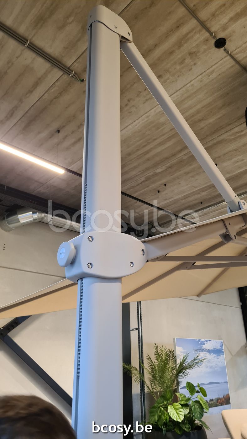 Model: Vrijhangende parasol met opendraaier. Mast en baleinen zijn van gepoederlakt aluminium.