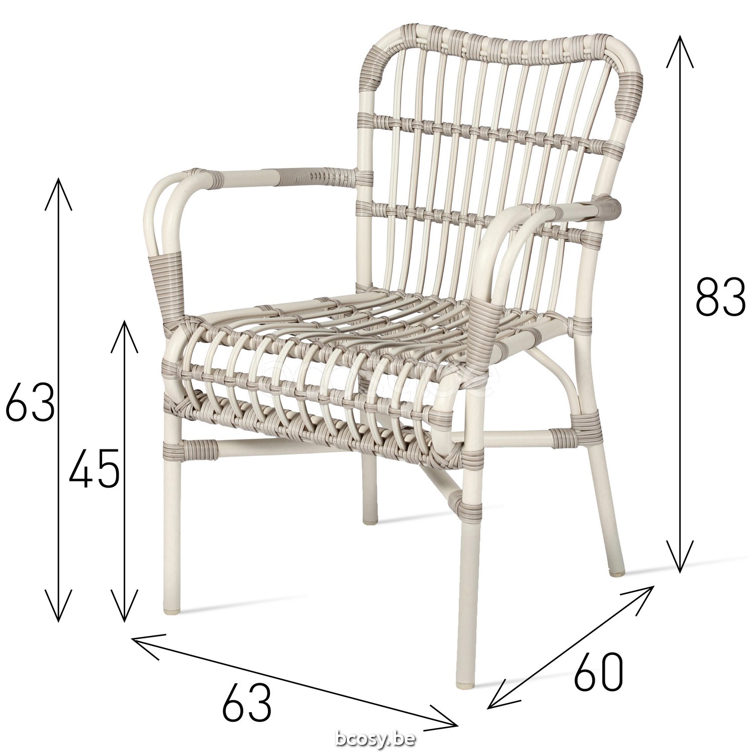 Materiaal: Polyethyleen vlechtwerk op een aluminium frame. Stapelbaar (max. 4 stoelen / voorzichtig behandelen om beschadiging te voorkomen).