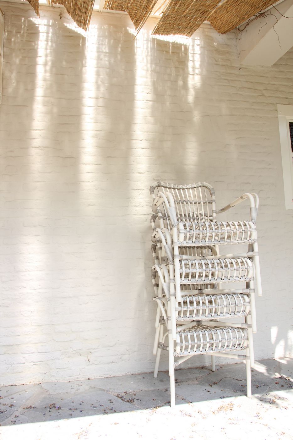 Material: Polyethylene wicker on an aluminium frame. Stackable (max. 4 chairs / handle with care to avoid damage).