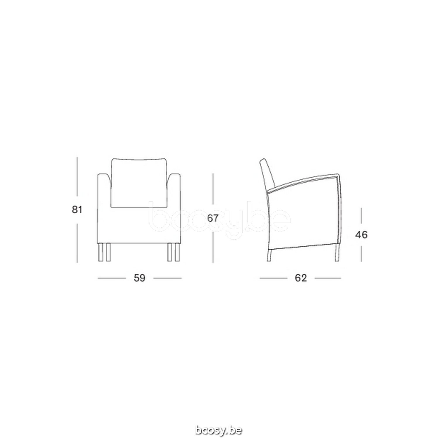 Afmetingen/Dimensions/Dimensionen: L=59 cm B=62 cm H=79 cm SH=46 cm AH=67 cm