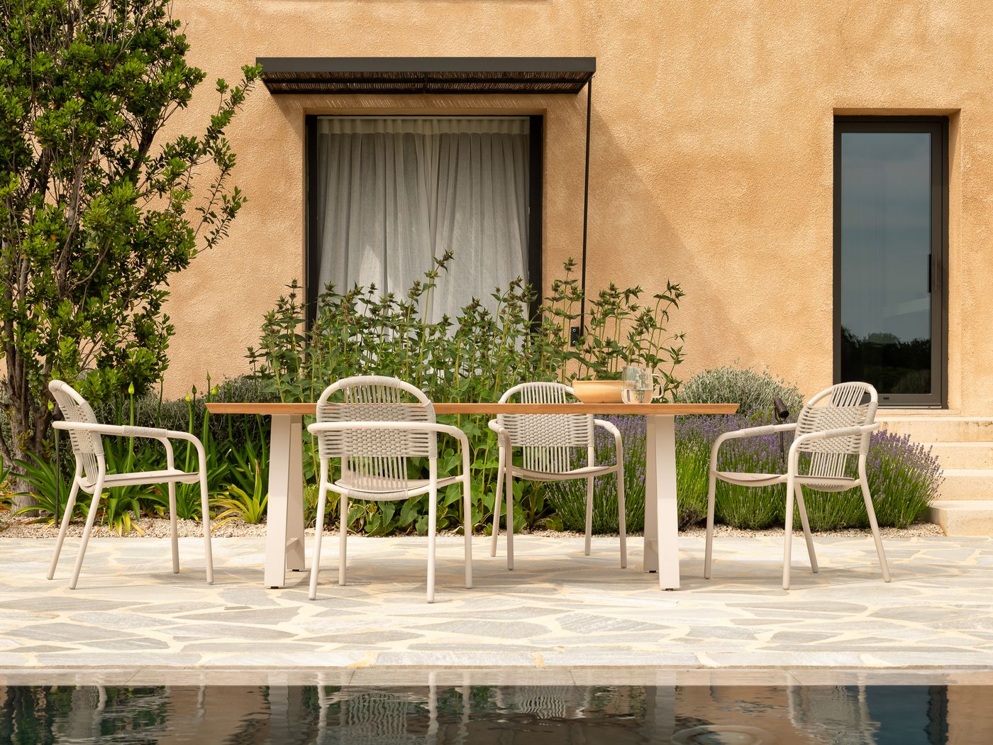 Material: Polypropylenseil auf einem pulverbeschichteten Aluminiumrahmen. Stapelbar für max. 4 Stühle. Vorsichtig handhaben, um Beschädigungen zu vermeiden.
