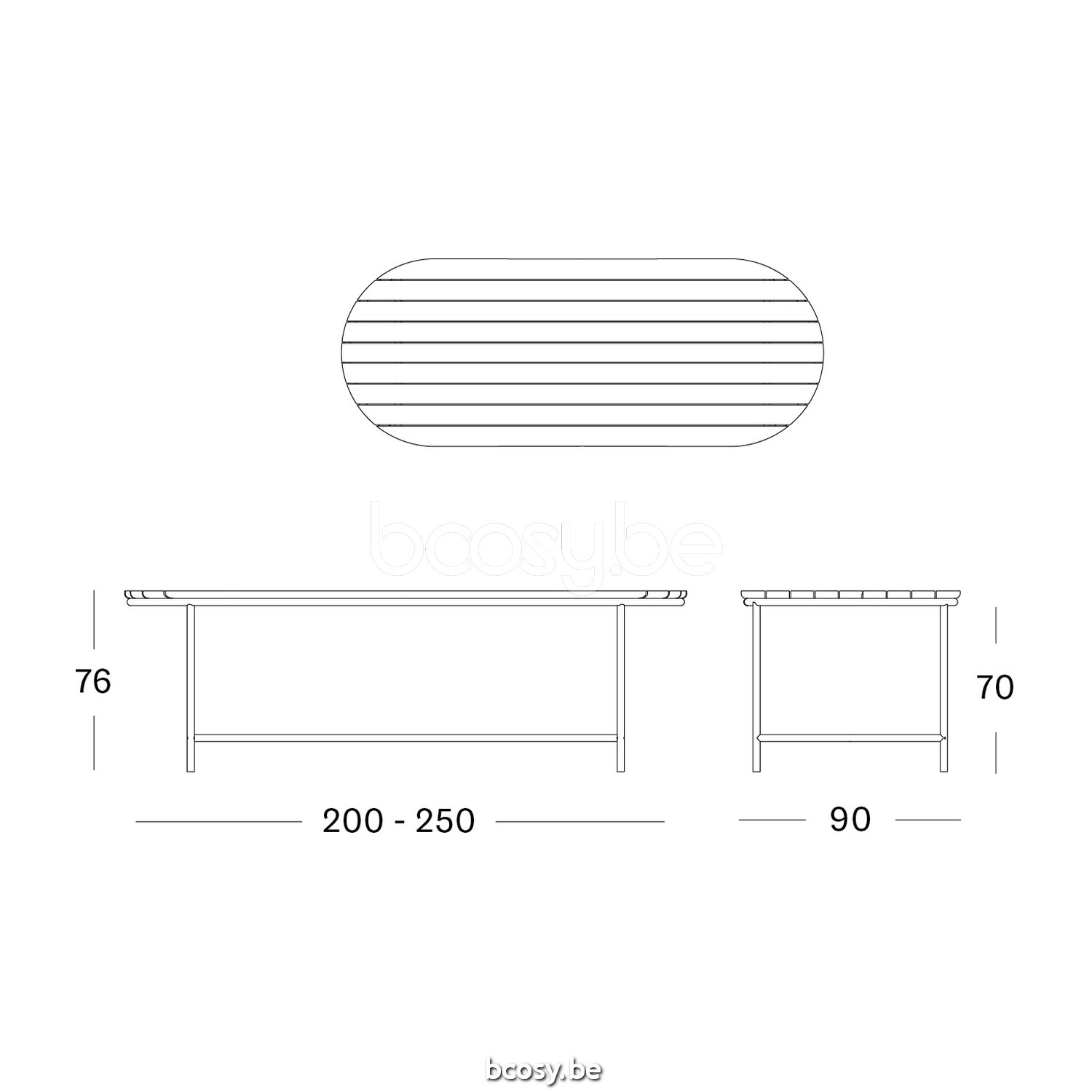 Afmetingen/Dimensions/Dimensionen: L=250 cm B=90 cm H=76/70 cm