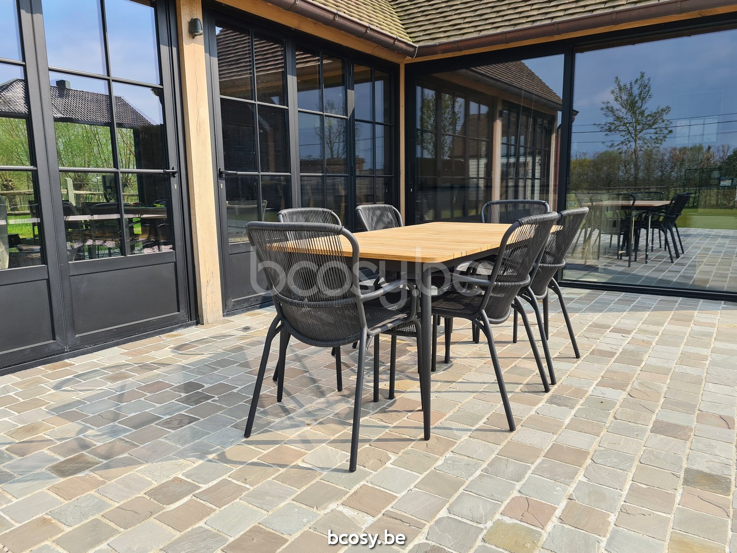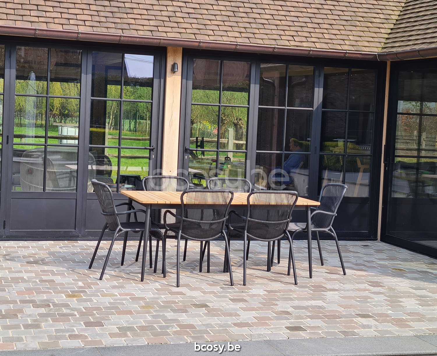 Materiaal: Structuur van gepoedercoat aluminium met een onbehandeld massief teakblad, keramisch blad of zwart HPL blad.