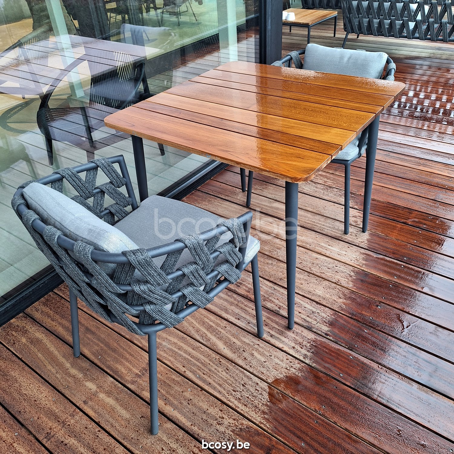 English: Vincent Sheppard Max Garden Dining Table Teak Top 90x90 Fossil Grey Aluminium frame Untreated Teak top