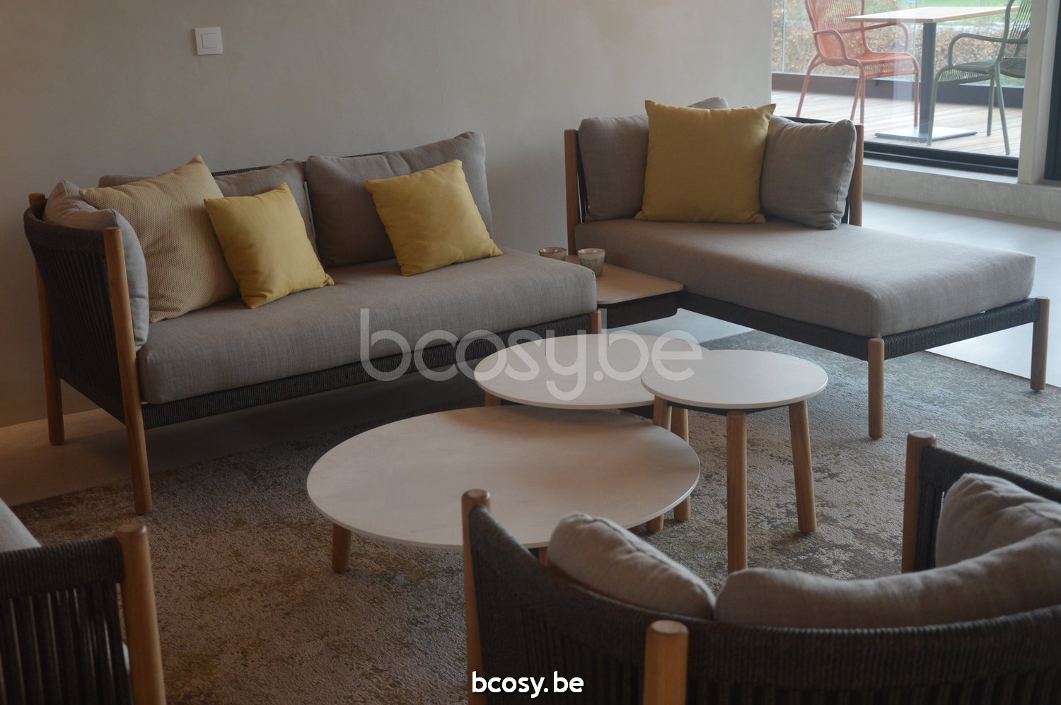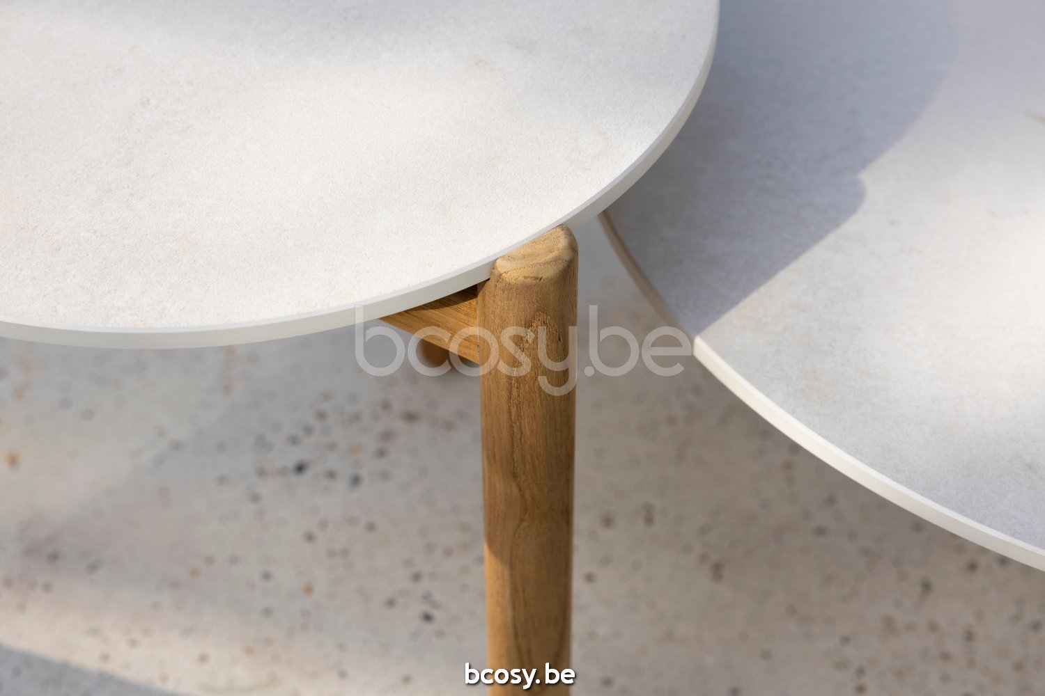 English: Vincent Sheppard Oda Round Garden Coffee Table Dia 68 Untreated Teak frame Portland Ceramic top 12mm